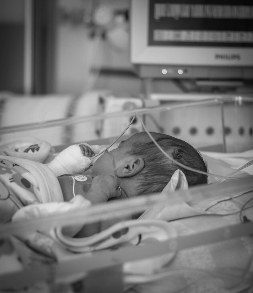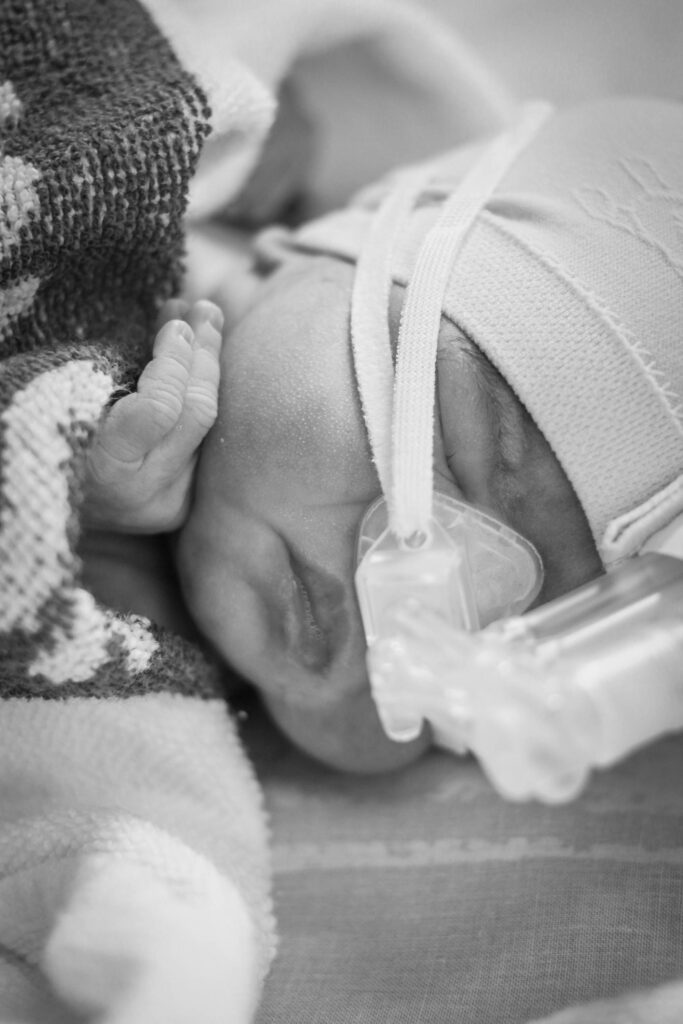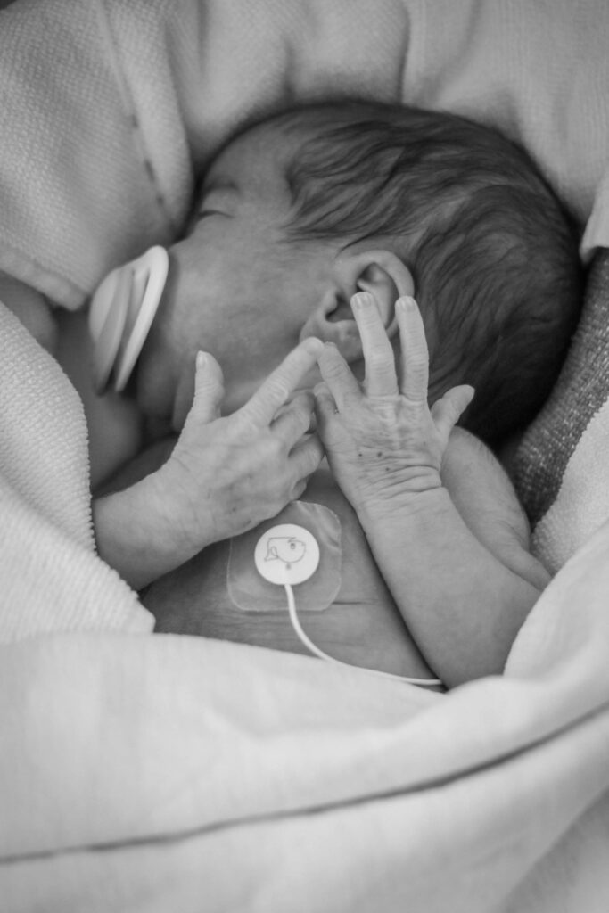 Personalen konstaterade ganska snabbt att hon hade blivit smittad och fått en hjärnhinneinflammation. Dagarna på neonatalavdelningen avlöste varandra och jag spenderade dag som natt där. Hon hade nålen i ena handen tills det inte funkade längre. Då bytte de till andra handen. Sen fick hon nålen i foten. En dag bad jag personalen att kolla på nålen eftersom jag tyckte att benet var ovanligt stort ända upp till midjan. De tog av bandaget och upptäckte att kärlet i foten hade spruckit och en blödning i benet hade uppstått.